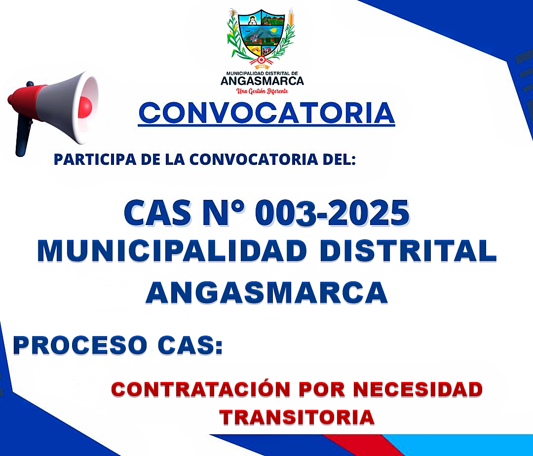 La Municipalidad Distrital de Angasmarca anuncia la Segunda Convocatoria CAS 003-2025, con 07 puestos laborales disponibles en las diferentes áreas de la entidad. 📝✨
